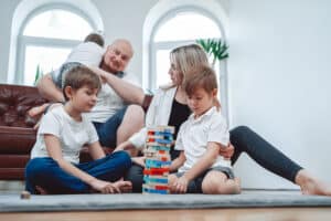 Family playing Jenga together, symbolizing togetherness and family values, in a cozy home setting, aligned with Loan Velocity's commitment to personalized support in securing financing.