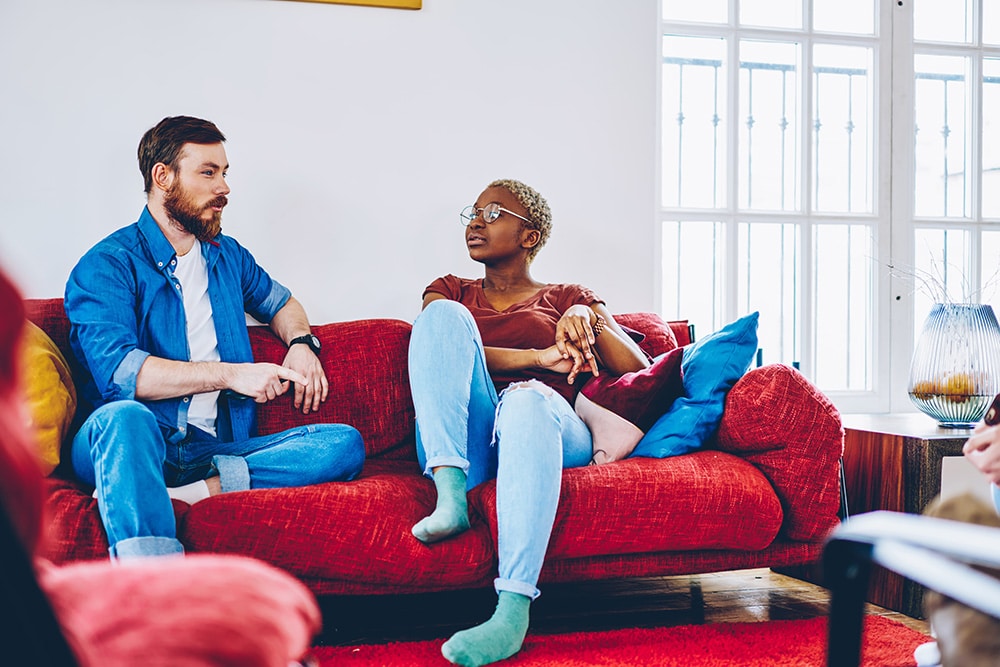 Dark-skinned hipster girl in optical spectacles discussing loan options with a colleague in a cozy setting, representing Loan Velocity, Inc.'s commitment to personalized mortgage services.