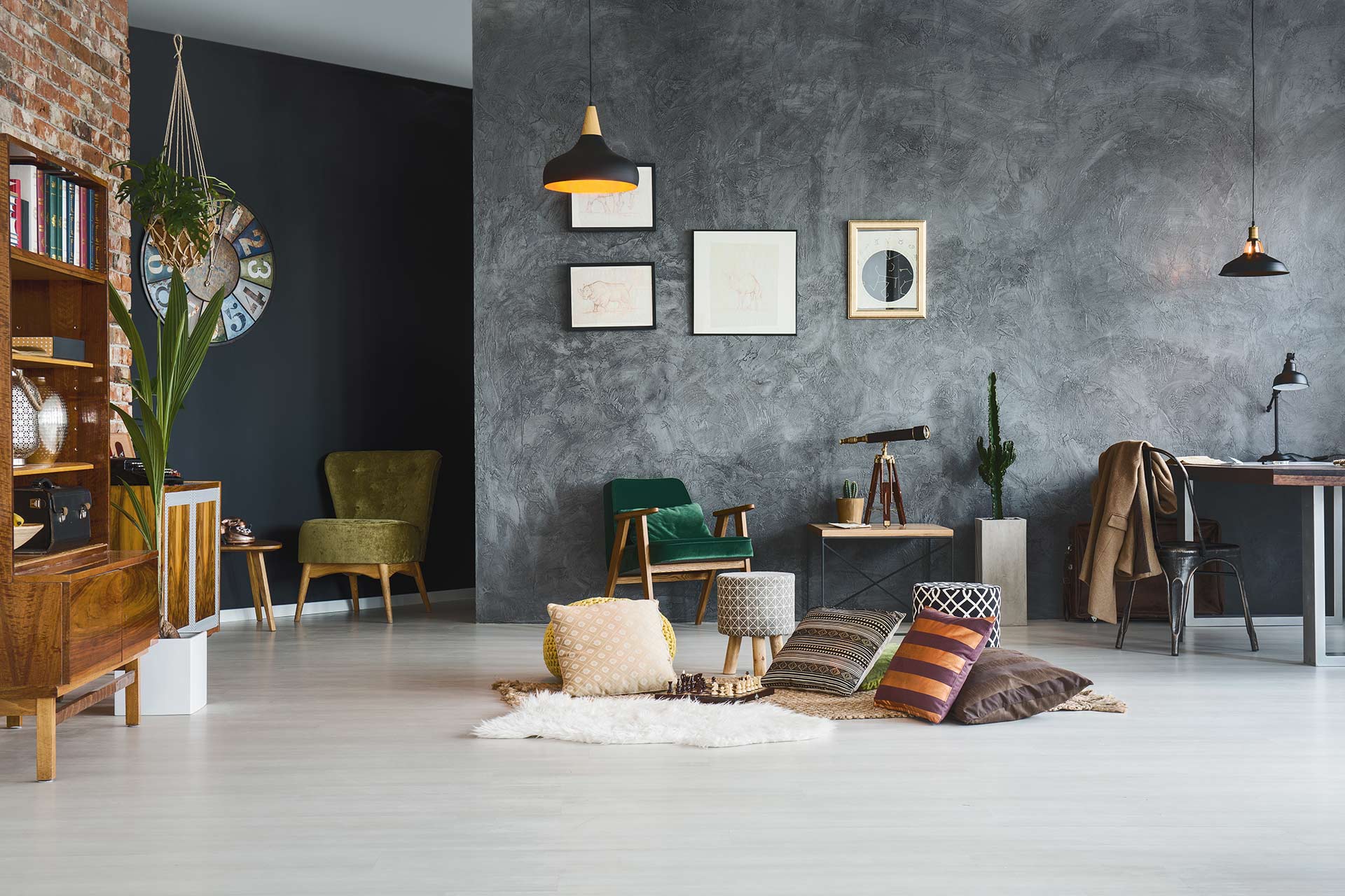 Modern room interior with travel souvenirs, cozy seating, and decorative elements, symbolizing personal journeys and Loan Velocity's commitment to tailored loan solutions.