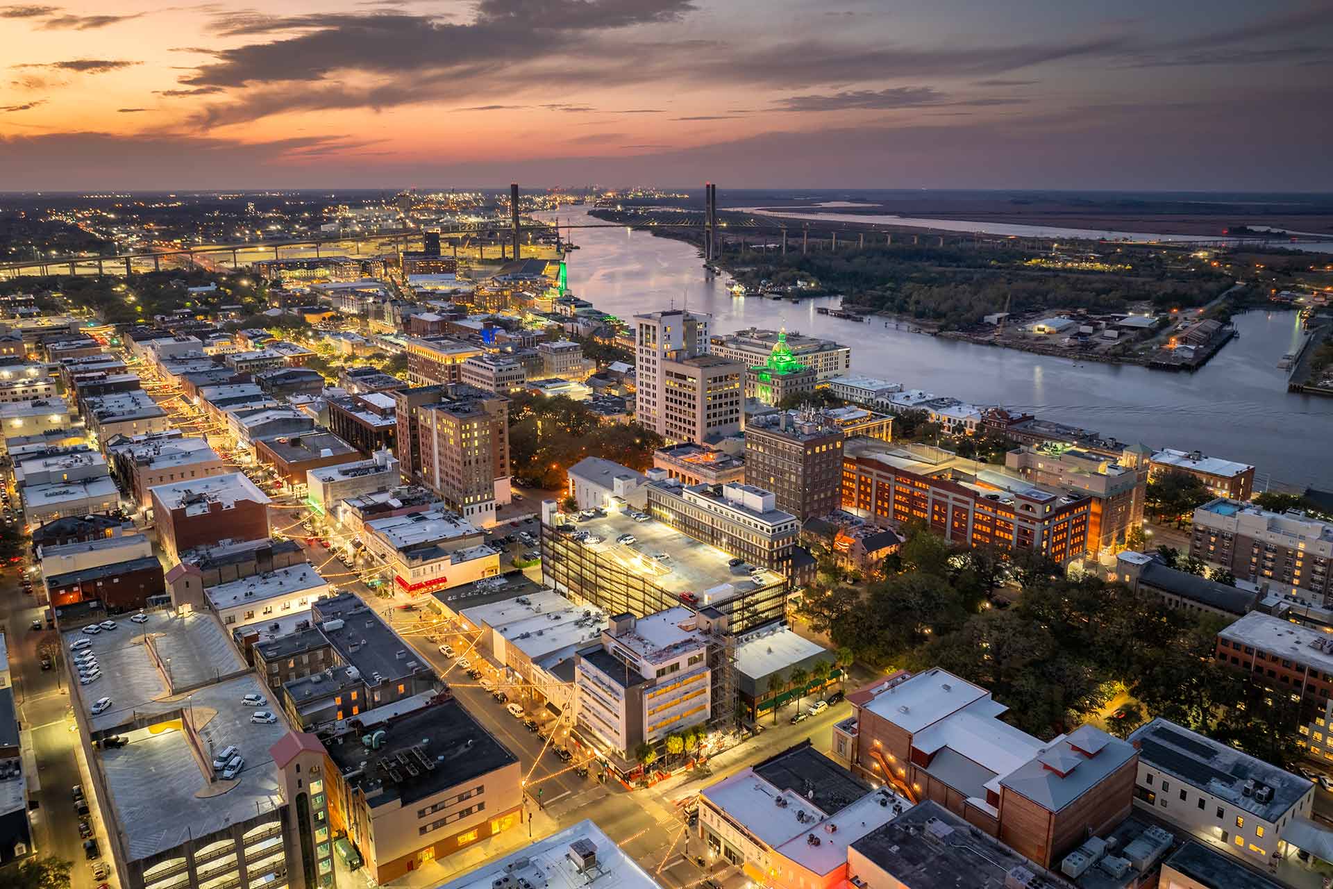 Aerial view of Savannah, Georgia at sunset, showcasing city lights, buildings, and the river, emphasizing the vibrant atmosphere relevant to local loan services.