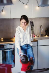 Young woman holding lavender flowers interacting with a small child in a cozy kitchen, symbolizing family support and connection in the context of securing financing and loans.