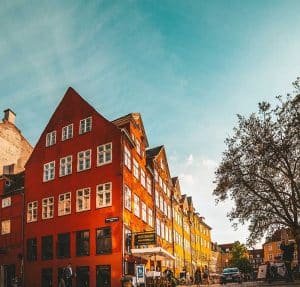 Colorful buildings in an urban setting, showcasing a mix of red and yellow facades, with people walking along the street under a clear blue sky.