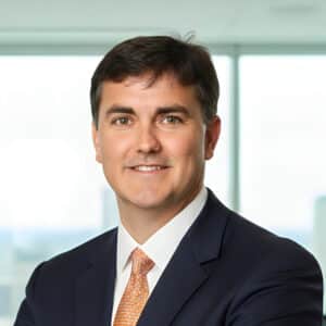Joe O'Connor, Loan Velocity team member, smiling in professional attire with a city skyline background, emphasizing expertise in mortgage services.