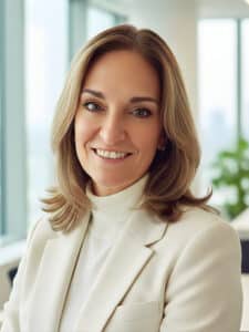 Karen Giannini, Loan Velocity team member, smiling portrait in professional attire, bright office setting with large windows and greenery.